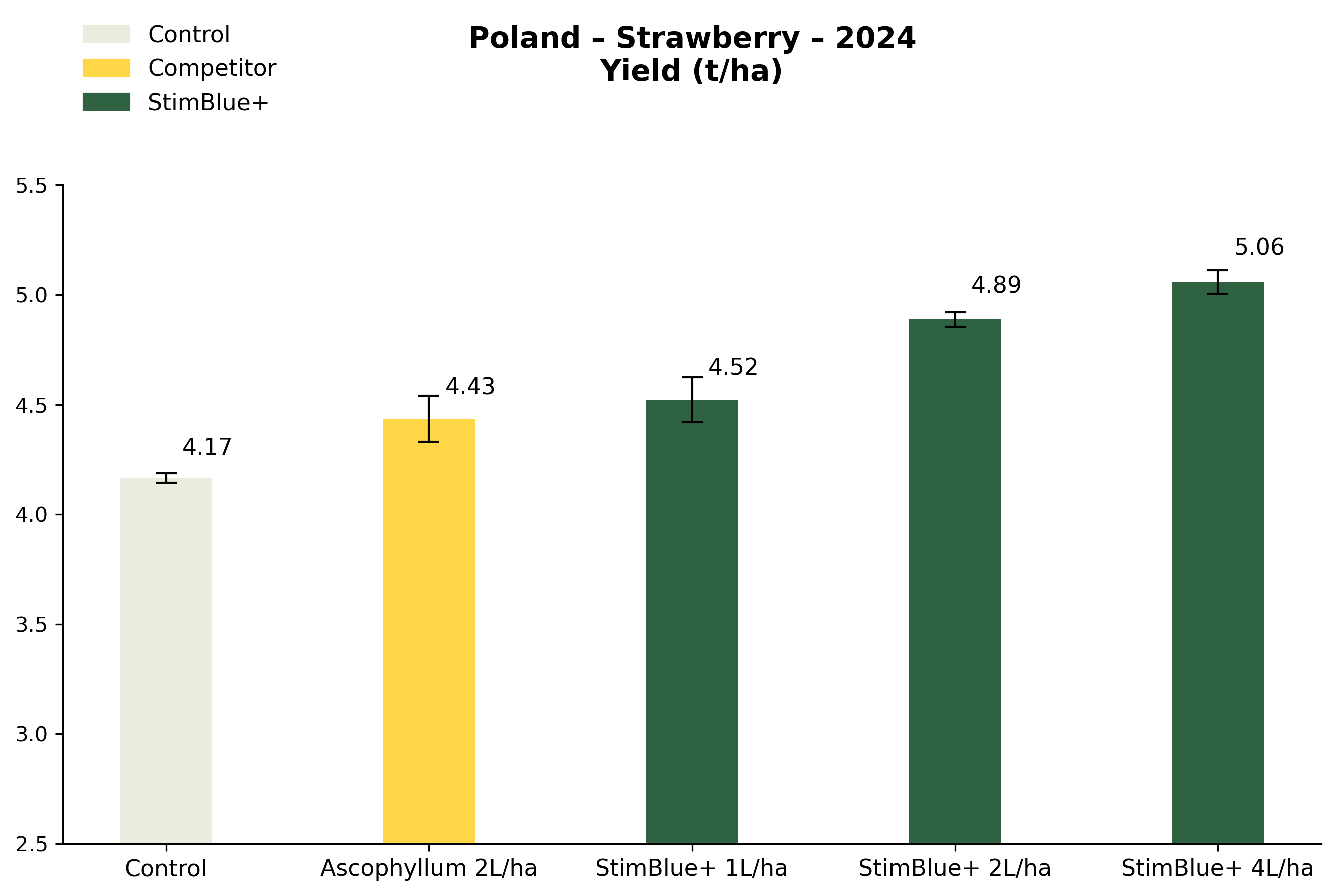 The number of marketable fruits increased in plots where StimBlue+ was applied by 14% vs control and 6% vs Ecklonia-based competitor. Results found by the independent research organisation Staphyt in Poland.