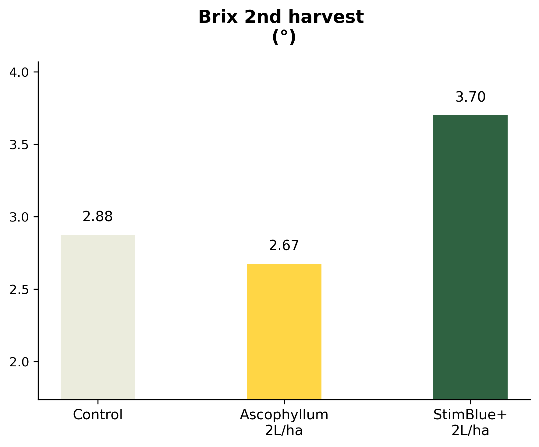 Just before harvest, StimBlue+ plants showed higher Brix levels than both the control and the competitor. StimBlue+ reached 3.70, while the control measured 2.88 and the competitor 2.67—representing a 29% increase over the control and a 39% increase over the competitor.